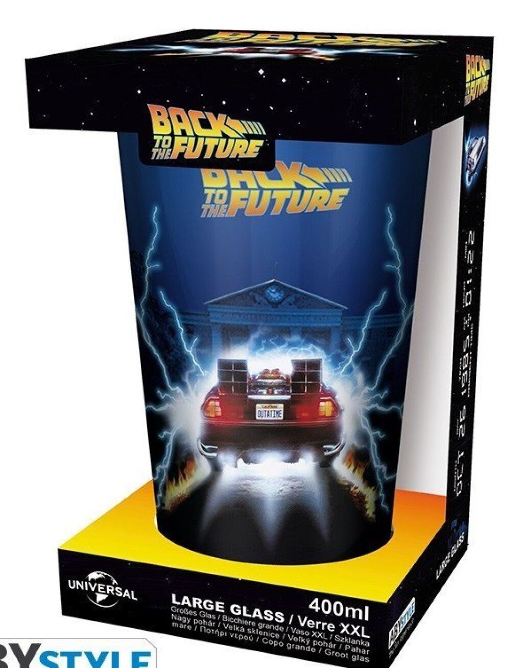 Back to the Future groot drinkglas met een inhoud van 400 ml. Het glas heeft een print van de Delorean. Niet geschikt voor de vaatwasser of magnetron. Nieuw in verpakking. Gemaakt door Abystyle. Verzendmethode binnen Nederland is pakketpost.