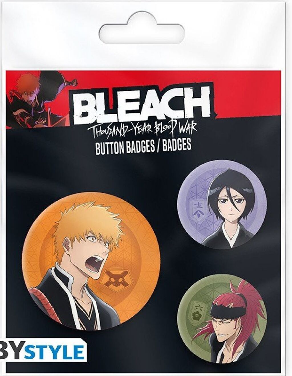 Bleach badge pack met 3 badges / buttons in deze verpakking met Ichigo, Rukia en Renji. Het grote formaat is ongeveer 5 cm doorsnede; de twee kleine buttons zijn ongeveer 3 cm doorsnede. Gemaakt door Abystyle. Nieuw in verpakking. Verzendmethode binnen Nederland is brievenbuspost.