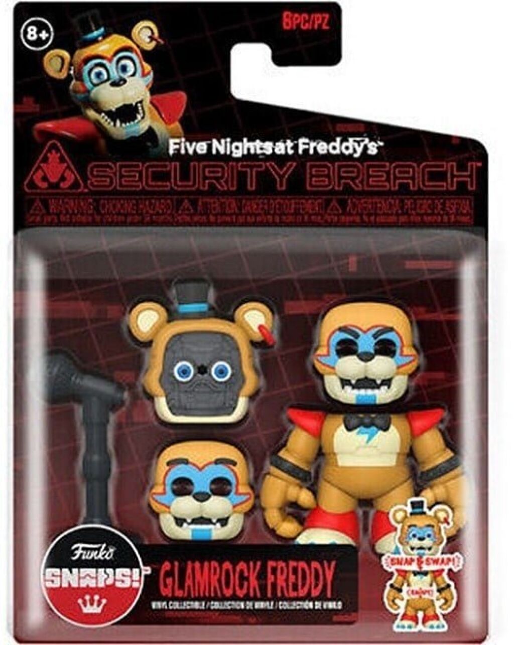 Five Nights at Freddy's snaps actiefiguur Glamrock Freddy. Afmeting van deze snap & swap action figure is ongeveer 9 cm. Gemaakt door Funko. Nieuw in verpakking. Verzendmethode binnen Nederland is pakketpost.