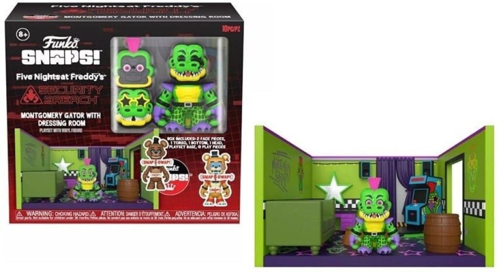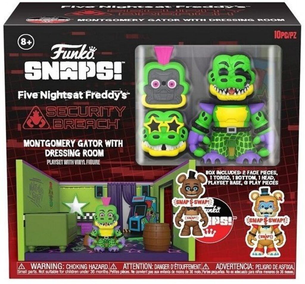 Five Nights at Freddy's snaps playset Montgomery Gator with Dressing Room. Afmeting van deze snap & swap action figure is ongeveer 9 cm. Gemaakt door Funko. Nieuw in verpakking. Verzendmethode binnen Nederland is pakketpost.