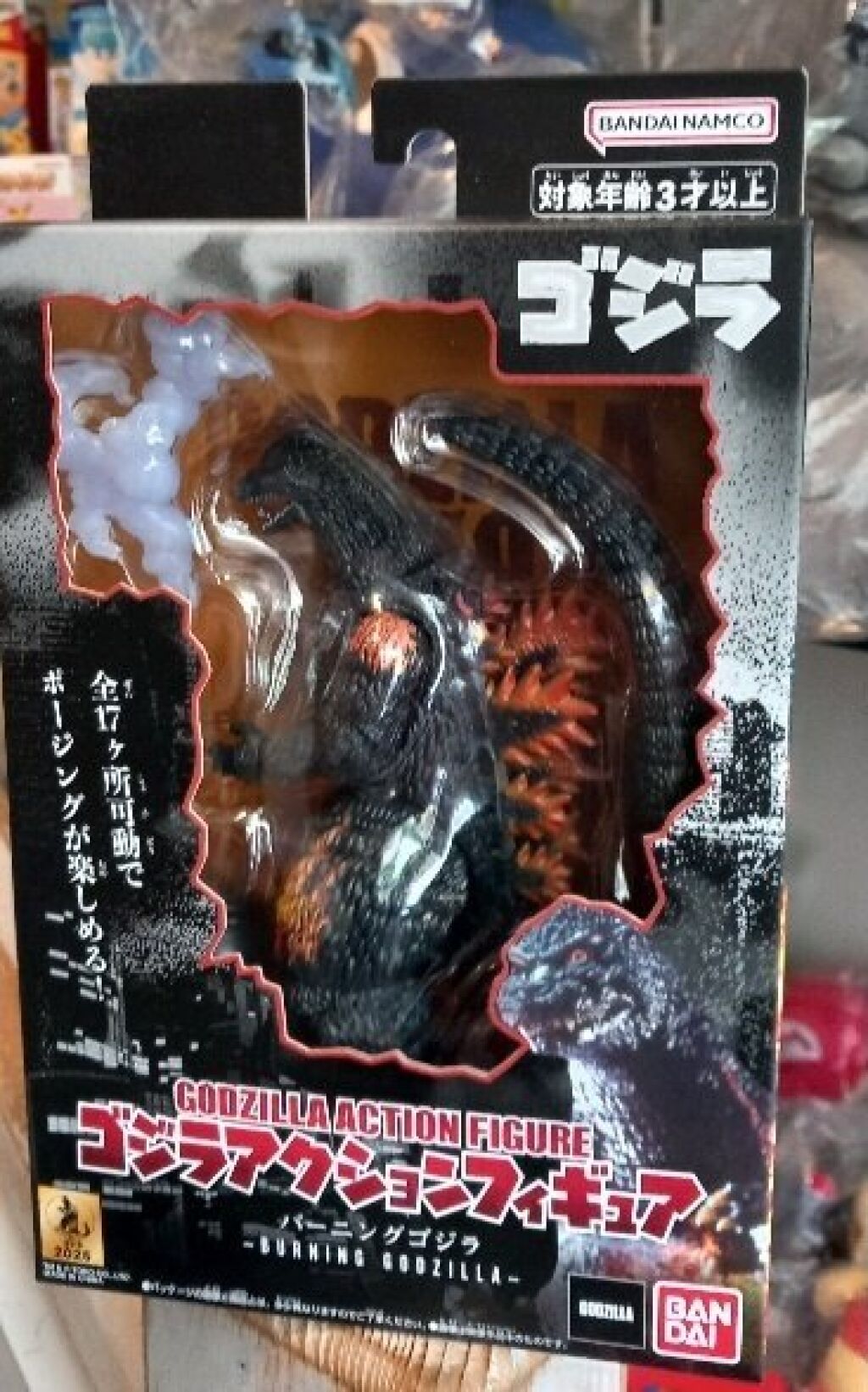 Godzilla actiefiguur Burning Godzilla. Dit is een action figure van 15 cm. Gemaakt door Bandai. Nieuw in verpakking. Verzendmethode binnen Nederland is pakketpost.