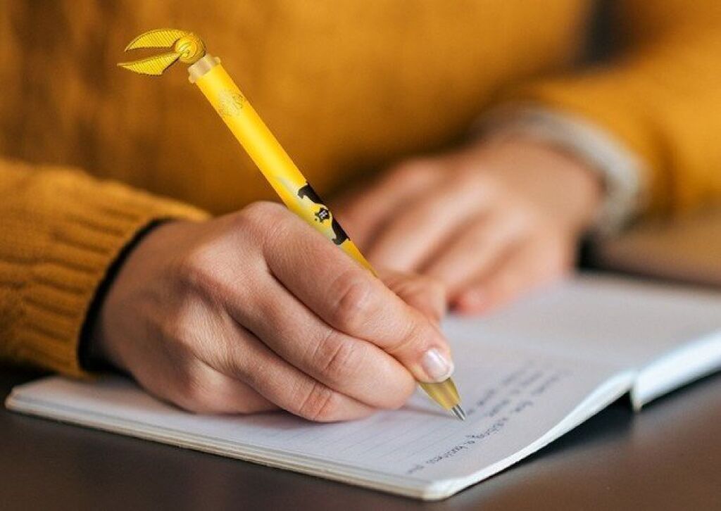 Harry Potter pen in het geel met de golden snitch aan het uiteinde. Een afbeelding van Hufflepuff op de pen. Gemaakt door Abystyle. Verzendmethode is brievenbuspost.