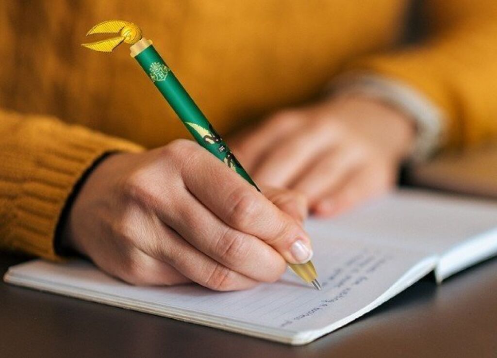 Harry Potter pen in het groen met de golden snitch aan het uiteinde. Een afbeelding van Slytherin op de pen. Gemaakt door Abystyle. Verzendmethode is brievenbuspost.