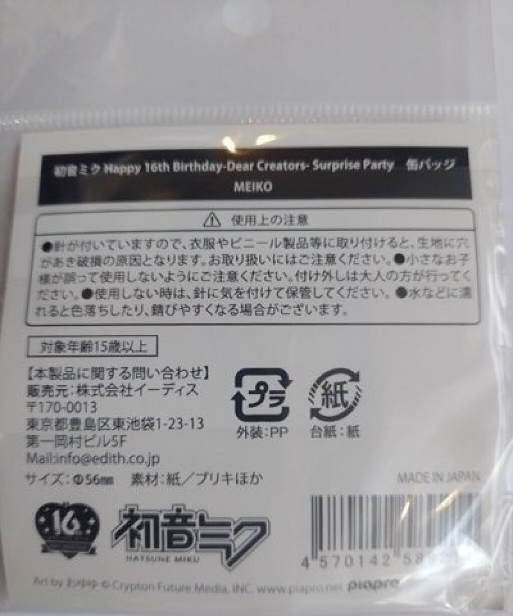 Hatsune Miku can badge / button in het thema 16th birthday. Op deze button staat Meiko. De doorsnede is ongeveer 5,60 cm groot. Er zijn meerdere karakters uit deze serie verkrijgbaar. Gemaakt door Piapro nieuw in verpakking. Import uit Japan. Verzendmethode binnen Nederland is brievenbuspost.