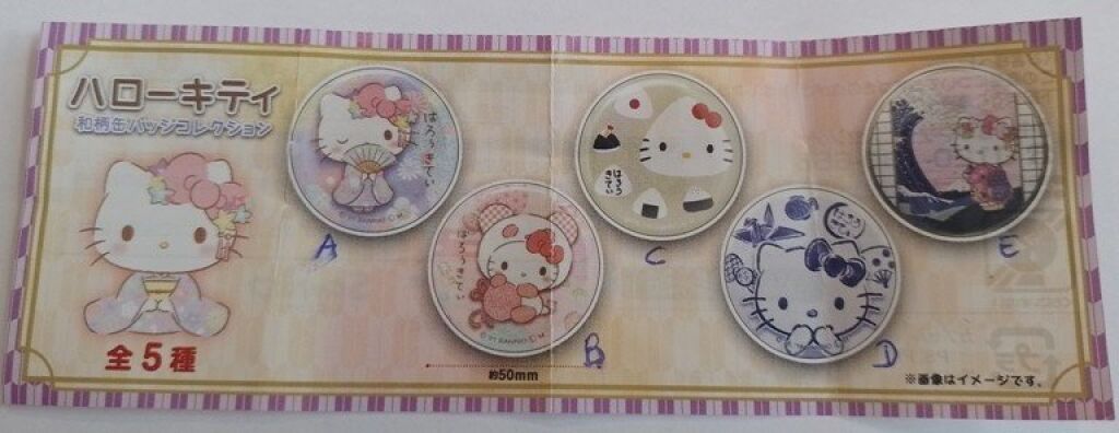 Hello Kitty button versie E. De button is ongeveer 5 cm groot. Deze gashapon serie komt uit Japan. Met officiele license van Sanrio. Er zijn meerdere versies uit deze serie verkrijgbaar. De button is nieuw. Verzendmethode is brievenbuspost.