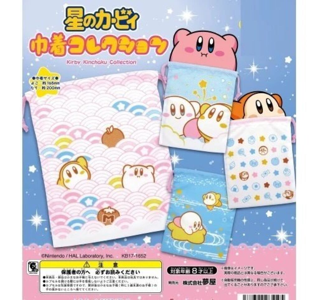 Kirby of the Stars drawstring tasje van stof heeft een afbeelding van o.a. Kirby en Waddle Dee in stempelstijl op een witte achtergrond. De voor- en de achterkant hebben een andere print. Het tasje is 17 x 20 cm groot. Er zijn meerdere uit deze gashapon serie verkrijgbaar. Gemaakt door Yumeya. Import uit Japan. Verzendmethode binnen Nederland is brievenbuspost.
