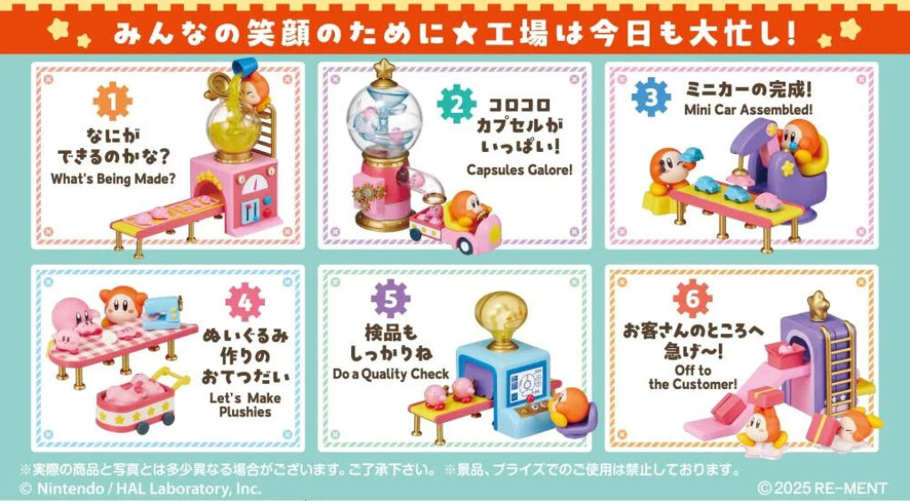 Kirby Re-Ment Waddle Dee's Toy factory. Deze serie bestaat uit allerlei miniatuur onderdelen die met een speelgoedfabriek te maken hebben en een figuurtje of items hebben met afbeeldingen van Kirby en Waddle Dee. In dit doosje #3 Mini Car Assembled! zitten alle onderdelen om dit miniatuur setje te maken. Er zijn van deze serie nog meerdere versies verkrijgbaar.