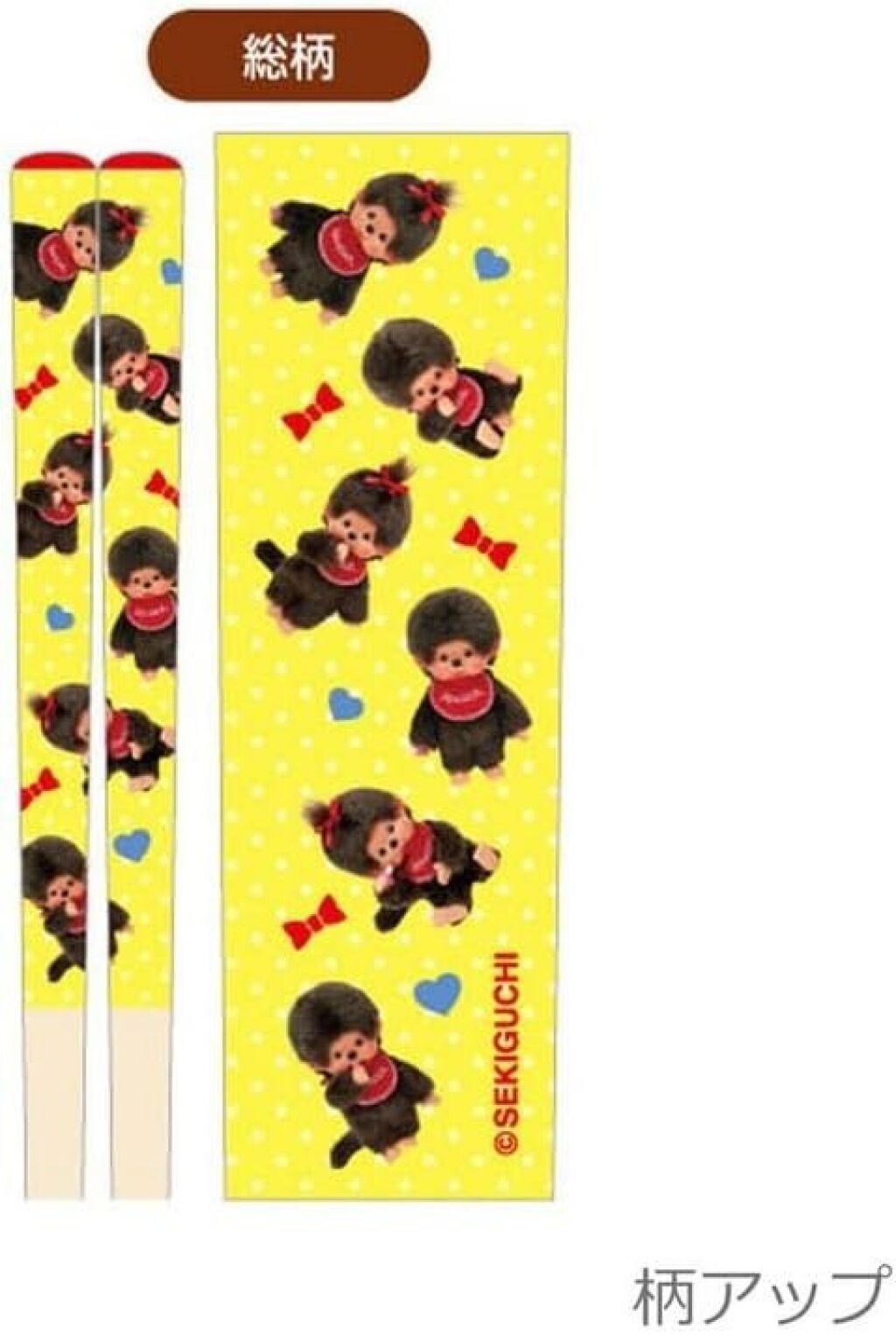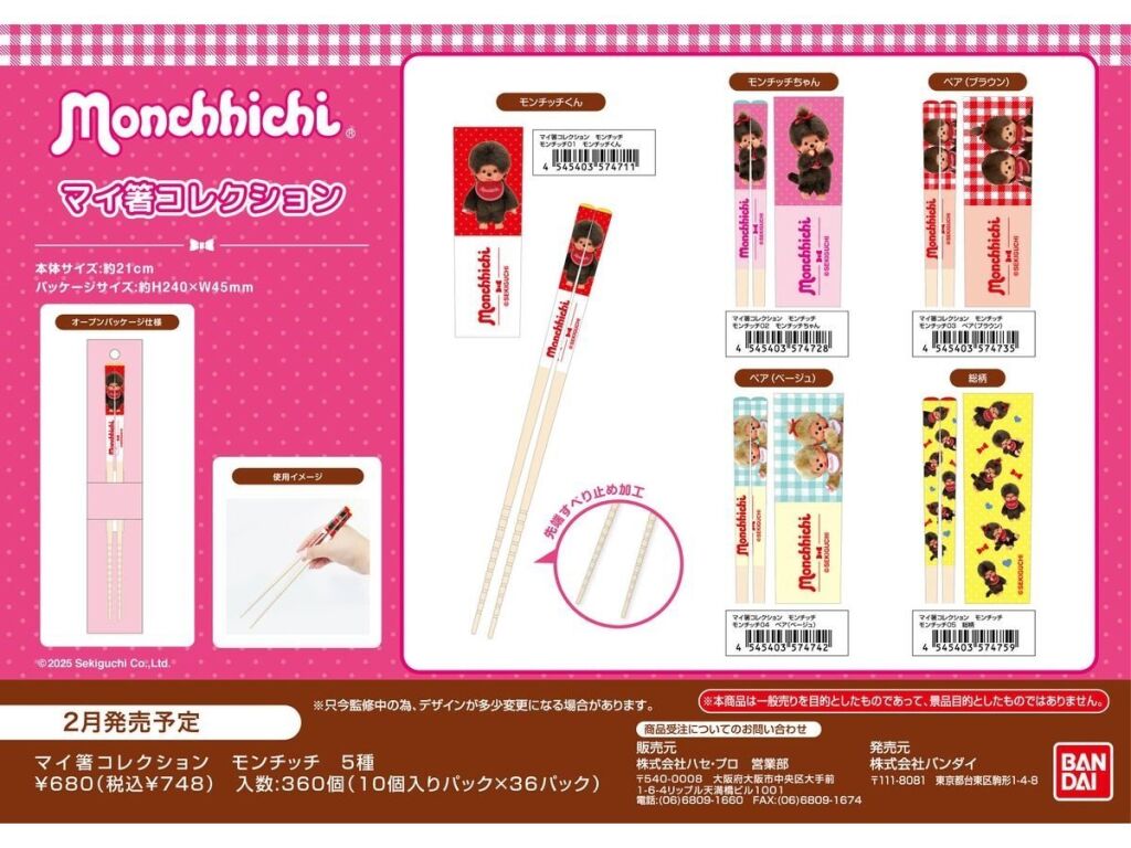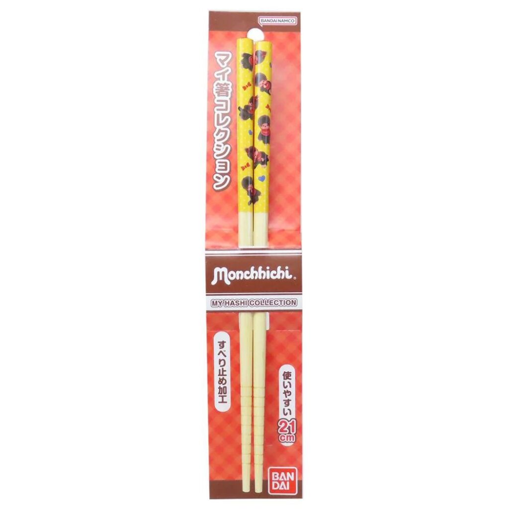 Monchhichi chopsticks met een afbeeldingen van Monchhichi op gele achtergrond. Twee chopsticks van ongeveer 21 cm lang. Nieuw in verpakking. Gemaakt door Bandai Namco; import uit Japan. Dit is de laatste versie die nog verkrijgbaar is van deze chopsticks. Verzendmethode binnen Nederland is pakketpost.