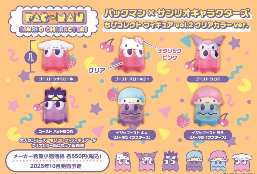 Pac-Man x Sanrio characters chibi collect figure serie 2 clear color version. Deze crossover van Pac-man met Sanrio geeft spookjes / geesten van Pac-Man een Sanrio uiterlijk. Dit figuurtje van Ghost Cinnamoroll is ongeveer 3 cm groot. Er zijn van deze serie nog meerdere versies verkrijgbaar. Gemaakt door Megahouse. Import uit Japan. Nieuw in verpakking; de verpakking is alleen geopend om te zien welk figuurtje er in het doosje zit. Verzendmethode binnen Nederland is pakketpost.