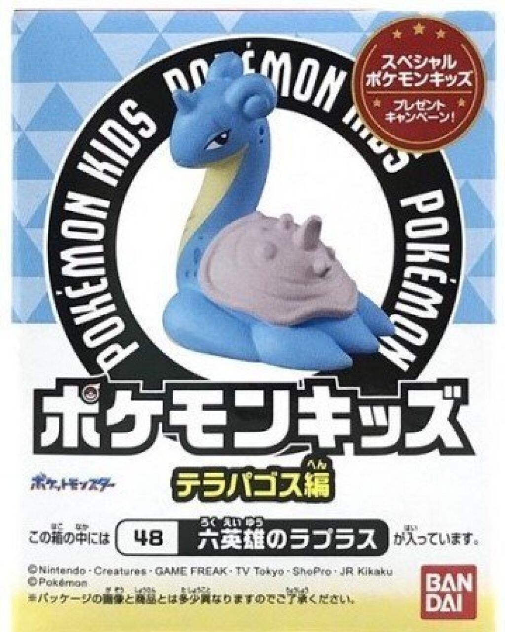 Pokemon Kids figuur Lapras van ongeveer 4 cm groot. Dit figuurtje is hol van binnen. Geschikt als vingerpoppetje. Er zijn meerdere figuurtjes uit deze serie (Terapagos series 2025) verkrijgbaar. Gemaakt door Bandai. Nieuw in verpakking. Verzendmethode binnen Nederland is pakketpost.