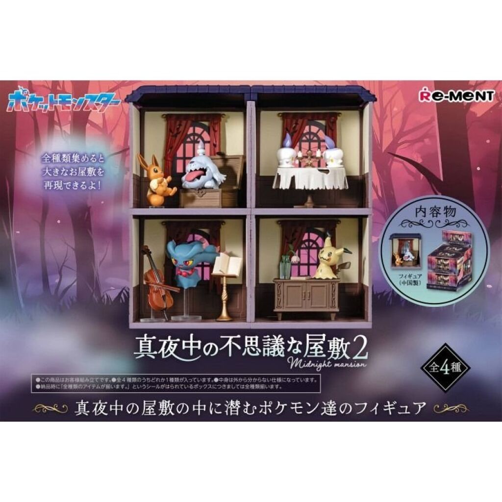 Pokemon Re-Ment Midnight mansion collection serie 2: doosje 3 met Misdreavus. Wanneer je meerdere versies koopt kan je deze aan elkaar koppelen. Het figuurtje is ongeveer 3 cm groot en het kamertje wordt ongeveer 7 x 7 cm groot. Er zijn nog meerdere versies uit deze serie verkrijgbaar. Gemaakt door Re-Ment. Import uit Japan. Nieuw in verpakking; de verpakking is alleen geopend om te zien welk figuurtje er in het doosje zit. Verzendmethode binnen Nederland is pakketpost.