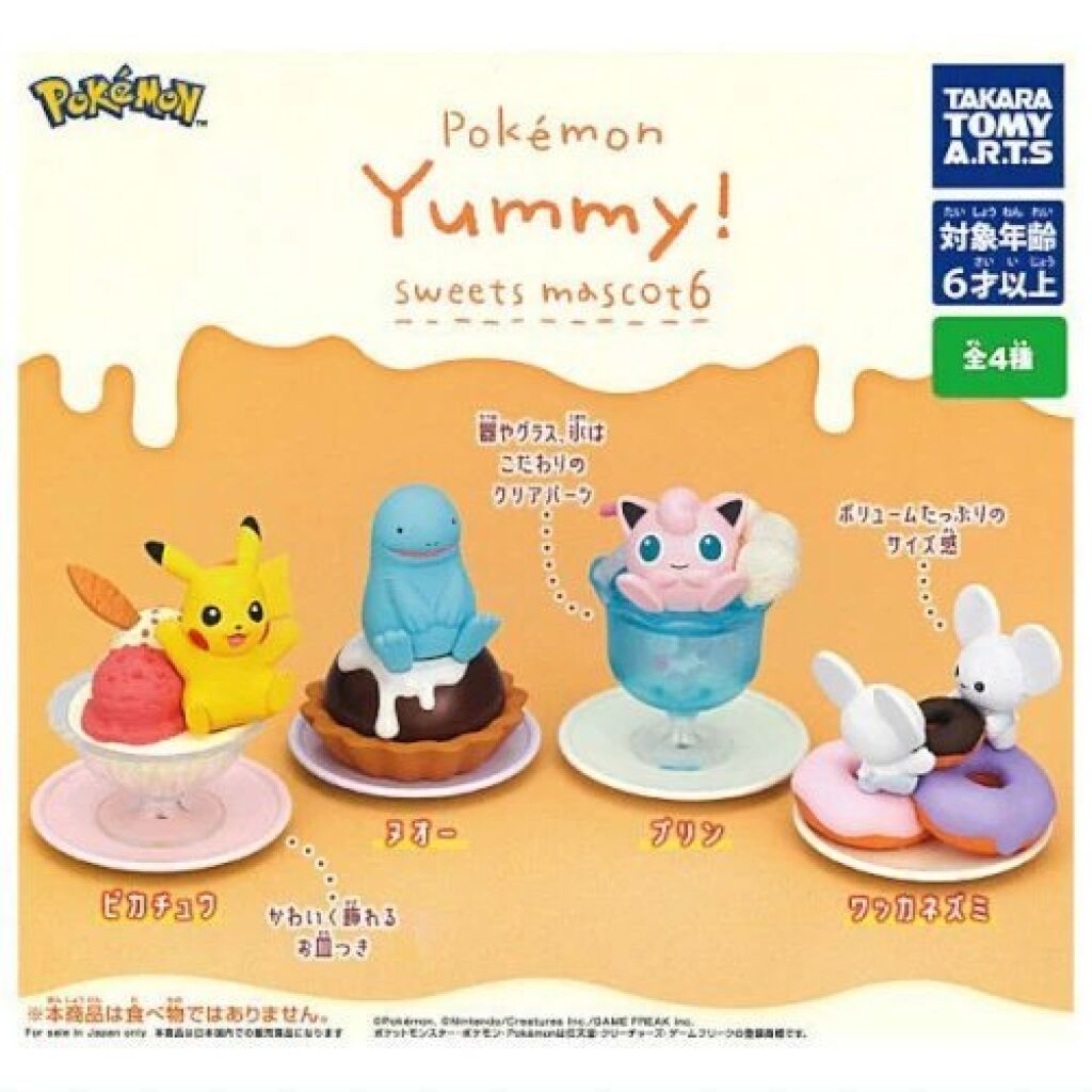 Pokemon Yummy! Sweets Mascot serie 6; Pikachu. Er zijn er meerdere uitgebracht in deze gashapon serie en ze zijn ongeveer 4-5 a 5 cm groot. Gemaakt door Takara Tomy A.R.T.S. Import uit Japan. Verzendmethode binnen Nederland is pakketpost.