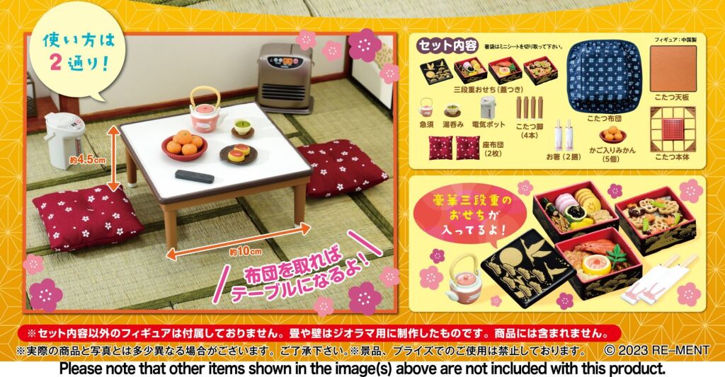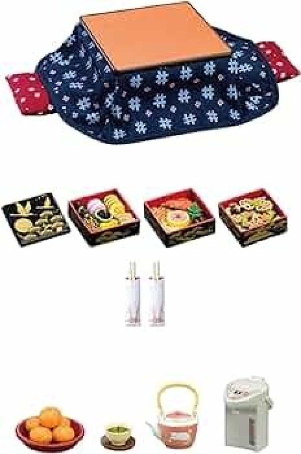 Re-Ment brings us a wonderful "Petite Sample" set focusing on a kotatsu! The kotatsu is the center of everyone's home in Japan. This low-to-the-ground table has a heating element underneath; a quilted cover is put over the frame to hold in the heat, and is held in place with the removable tabletop. In the wintertime, nothing beats sitting with your legs under the kotatsu and enjoying a great meal with family and friends. This set includes all the parts needed for the kotatsu, plus a gorgeous three-tiered New Year's Eve delicacies set in a detailed box! A bowl of mikan tangerines, chopsticks, and other items are included too.