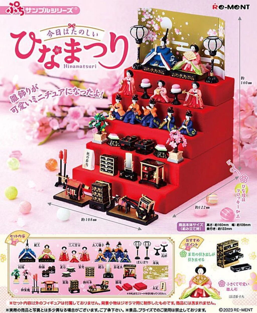 Re-Ment Petit Sample series Kyo Wa Tanoshii Hinamatsuri. Deze complete set heeft een afmeting van 10,8 cm x 12,2 cm x 16 cm. Gemaakt door Re-Ment. Import uit Japan. Nieuw in verpakking. Verzendmethode binnen Nederland is pakketpost.