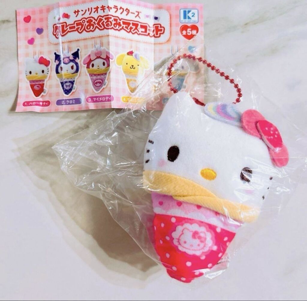 Sanrio Characters pluche hanger van een crepe / ijsje met het gezichtje van Hello Kitty. De hanger is ongeveer 8,5 cm groot. Er zijn er meerdere uitgebracht in deze gashapon serie. Gemaakt door K2 station. Import uit Japan. Verzendmethode binnen Nederland is brievenbuspost.