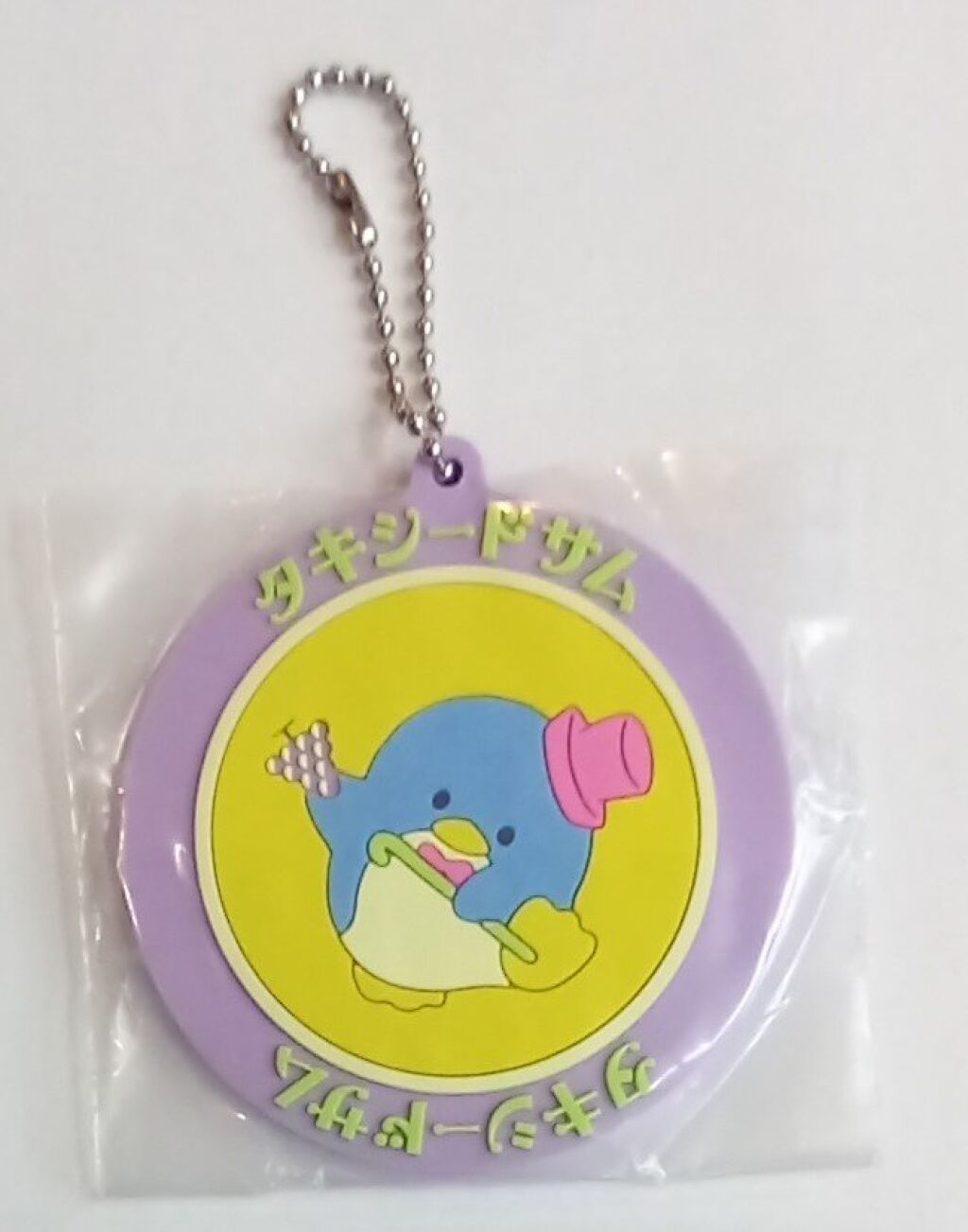 Sanrio characters rubberen sleutelhanger / keychain in retro stijl deze hanger heeft een afbeelding van Tuxedo Sam. De sleutelhanger is ongeveer 6 cm in doorsnede. Er zijn verschillende karakters van deze gashapon serie verkrijgbaar. Gemaakt door Koro Koro; import uit Japan. Verzendmethode is brievenbuspost.