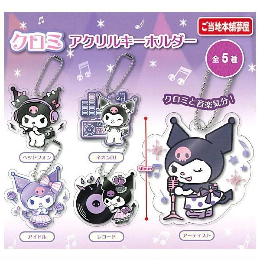 Sanrio Kuromi acryl sleutelhanger in het thema muziek met een afbeelding van Kuromi als artiest. De hanger is ongeveer 5 cm groot. Er zijn er meerdere uitgebracht in deze gashapon serie. Gemaakt door Yumeya. Import uit Japan. Verzendmethode binnen Nederland is brievenbuspost.