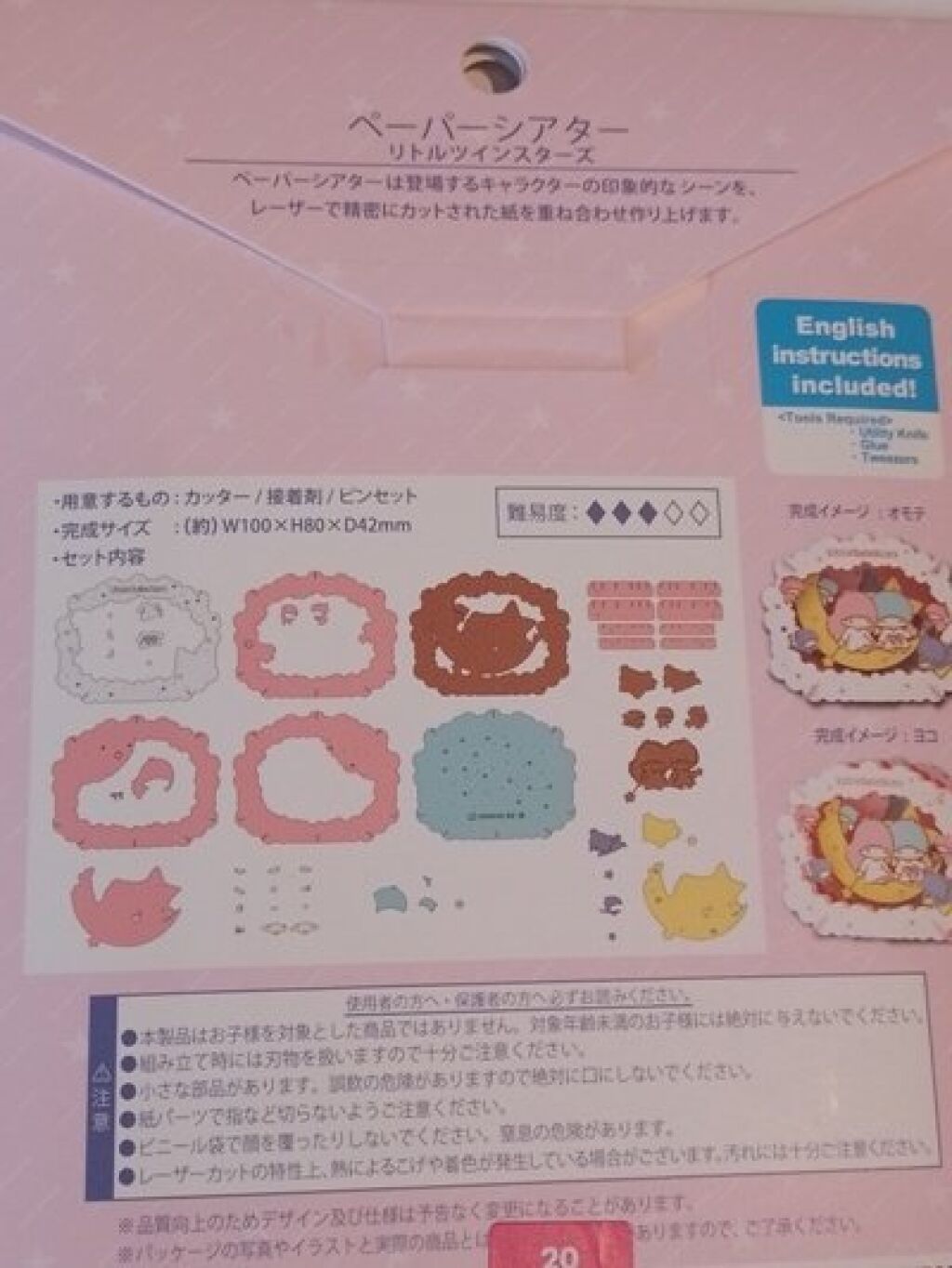 Sanrio Paper Theater set van Little Twin Stars (PT-309). Dit pakketje bevat alle onderdelen om dit papieren theatertje in elkaar te zetten. Er zit een Engelse instructie bij. Officiele license. Gemaakt door Ensky; import uit Japan. Nieuw in verpakking. Verzendmethode is brievenbuspost binnen Nederland.