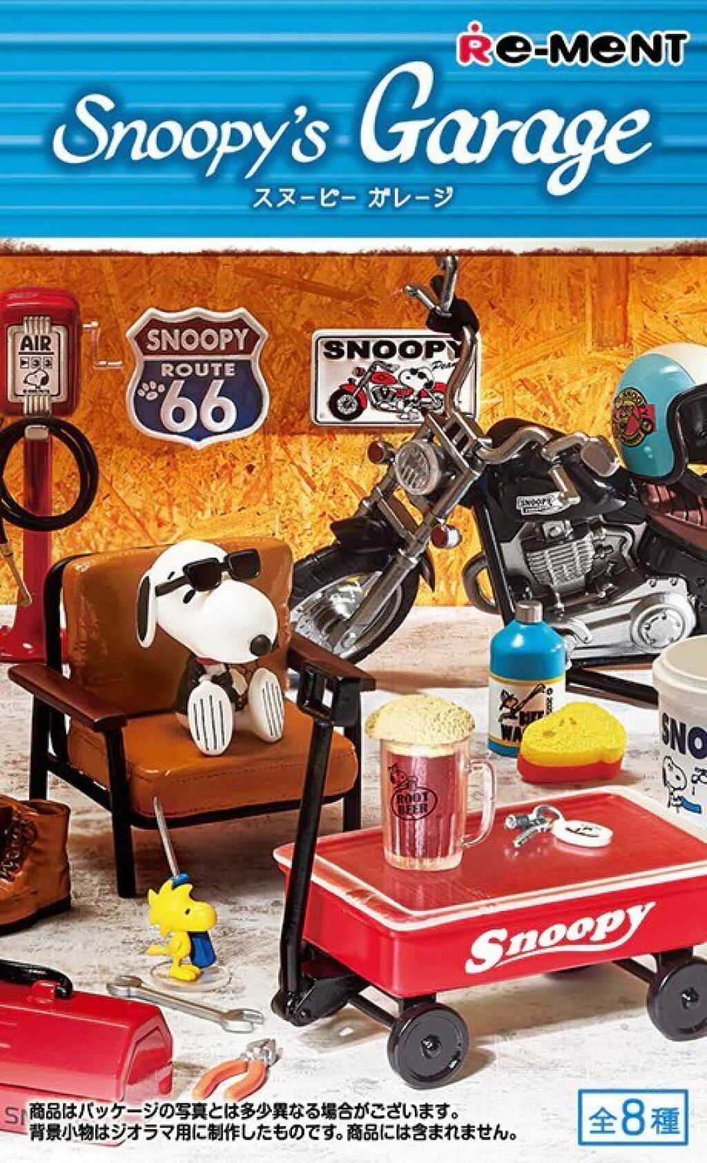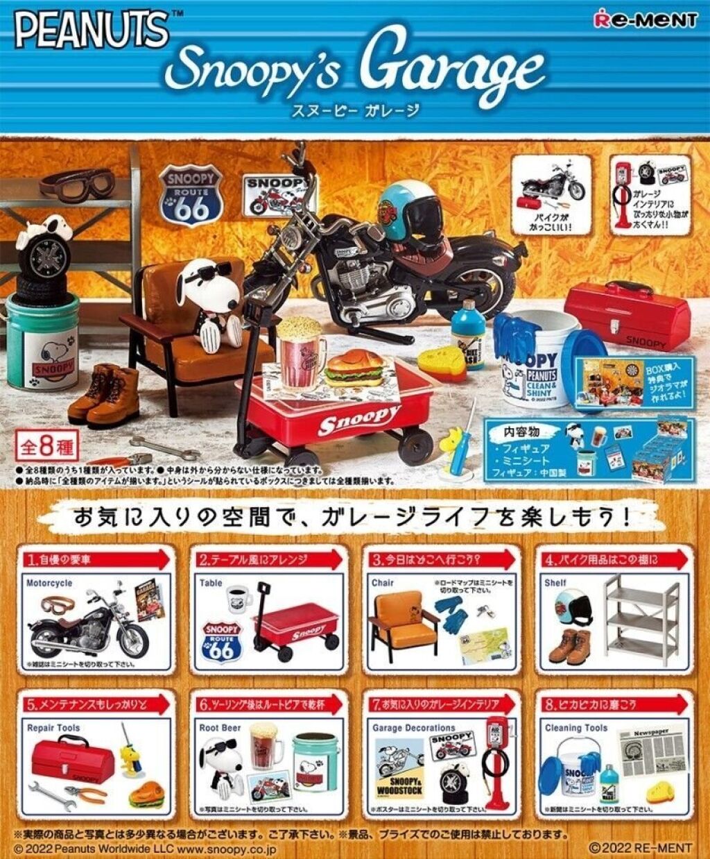Snoopy Re-Ment serie Snoopy's Garage. Deze serie bestaat uit allerlei miniatuur onderdelen die met een garage / motorrijden te maken hebben en met afbeeldingen of figuurtjes van Snoopy. In dit doosje #5 zitten alle onderdelen om dit miniatuur setje te maken. Het wordt ongeveer 4 tot 6 cm groot. Er zijn van deze serie nog meerdere versies verkrijgbaar. Import uit Japan. Nieuw in verpakking; de verpakking is alleen geopend om te zien welke items er in het doosje zitten. Verzendmethode binnen Nederland is pakketpost.