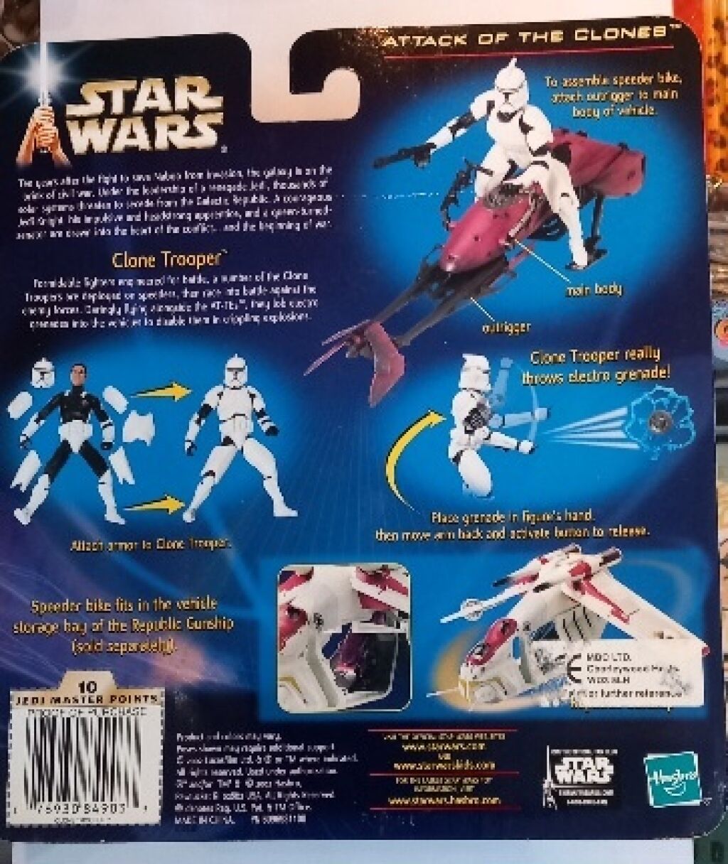 Star Wars actiefiguur Clone Trooper with Speeder Bike. Deze vintage Attack of the Clones action figure is gemaakt door Hasbro. Nieuw in verpakking. Verzendmethode binnen Nederland is pakketpost.