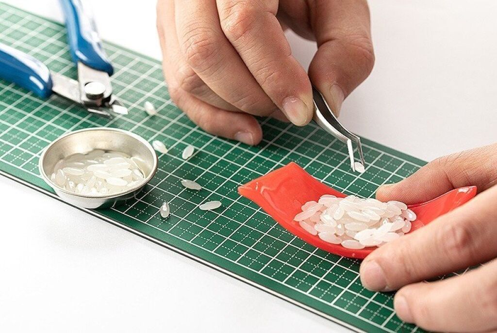 De kit bevat 364 rijstkorrels, net zo groot als hun echte tegenhangers. De speciale verpakking van de kit roept een nostalgisch beeld op van de verpakking van sushidozen uit de Japanse Showa-periode, met een touwtje in een knoop om als cadeau mee naar huis te nemen (vaak door dronken vaders). Voor de montage zijn plastic modellijm en klemmen nodig. Onderdelen om een stukje sushi te maken worden meegeleverd.