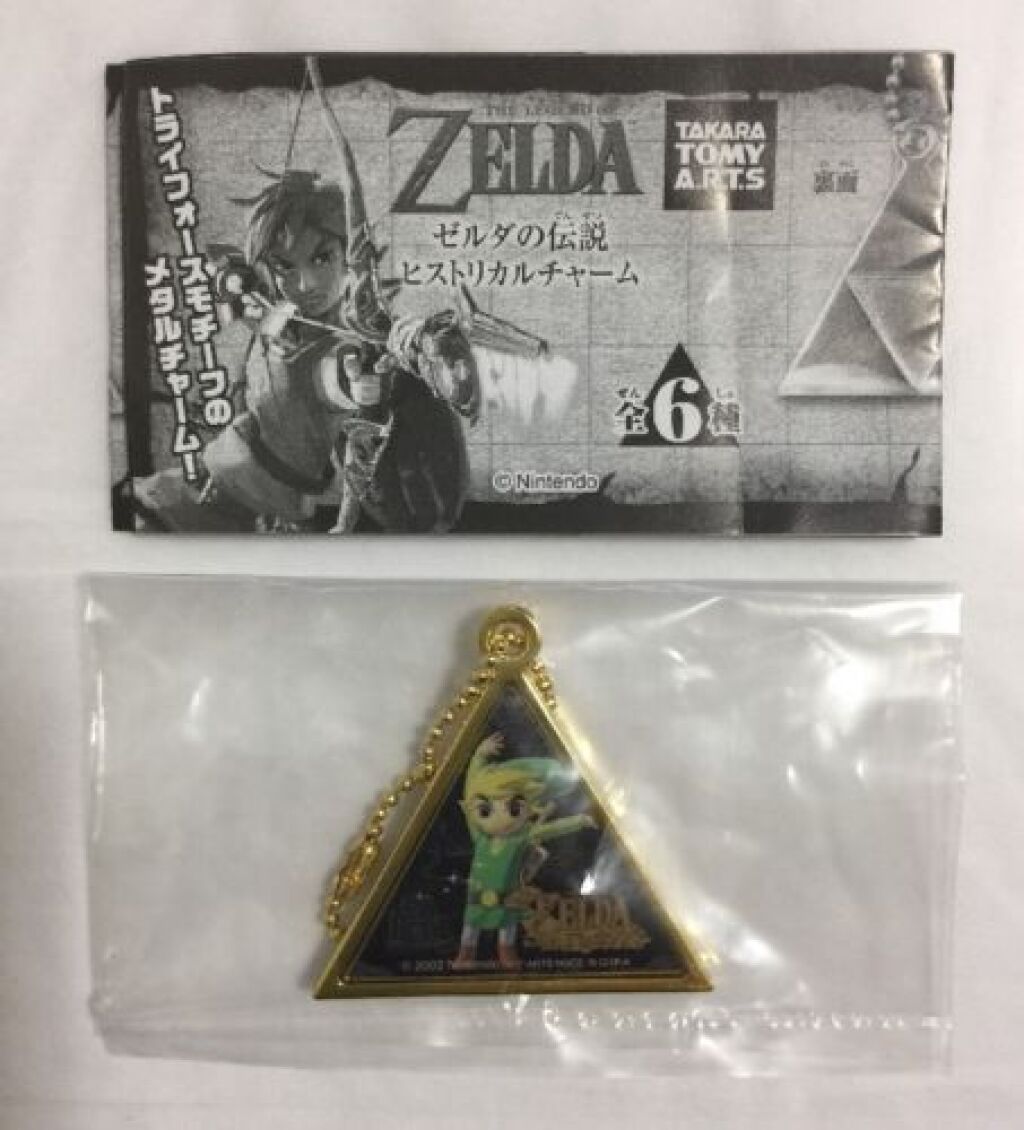 The Legend of Zelda Triforce sleutelhanger / keychain. De sleutelhanger is van metaal met een afbeelding van Wind Waker. De hanger is ongeveer 3,5 cm groot. Er zijn nog meerdere versies uit deze serie verkrijgbaar. Import uit Japan; gemaakt door Takara Tomy. Verzendmethode is brievenbuspost.