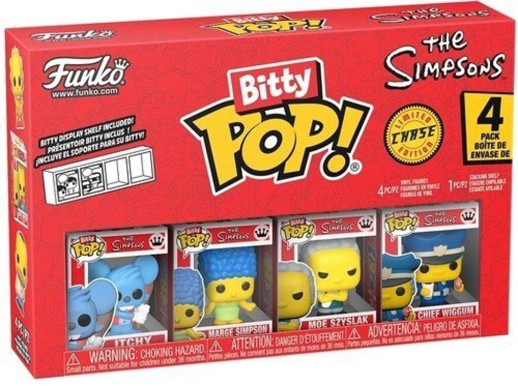 The Simpsons Bitty Pop set. In deze verpakking zitten Itchy, Marge Simpson, Moe Szyslak en Chief Wiggum. Het Funko figuurtje is ongeveer 2,5 cm groot. Gemaakt door Funko. Nieuw in verpakking. Verzendmethode binnen Nederland is pakketpost.