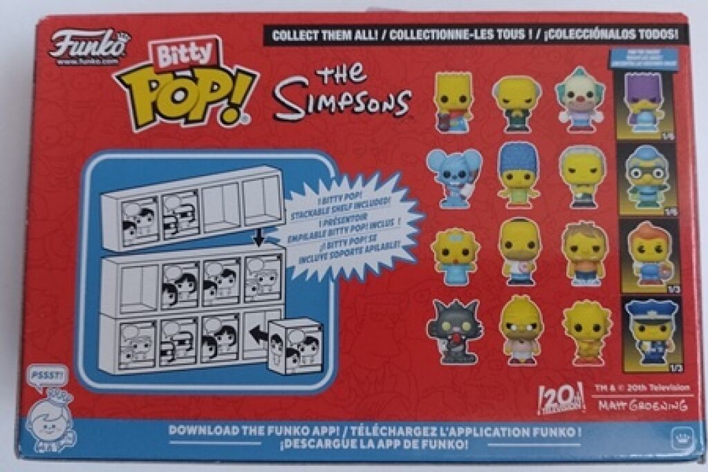 The Simpsons Bitty Pop set. In deze verpakking zitten Scratchy, Grampa Simpson, Lisa Simpson en Chief Wiggum. Het Funko figuurtje is ongeveer 2,5 cm groot. Gemaakt door Funko. Nieuw in verpakking. Verzendmethode binnen Nederland is pakketpost.