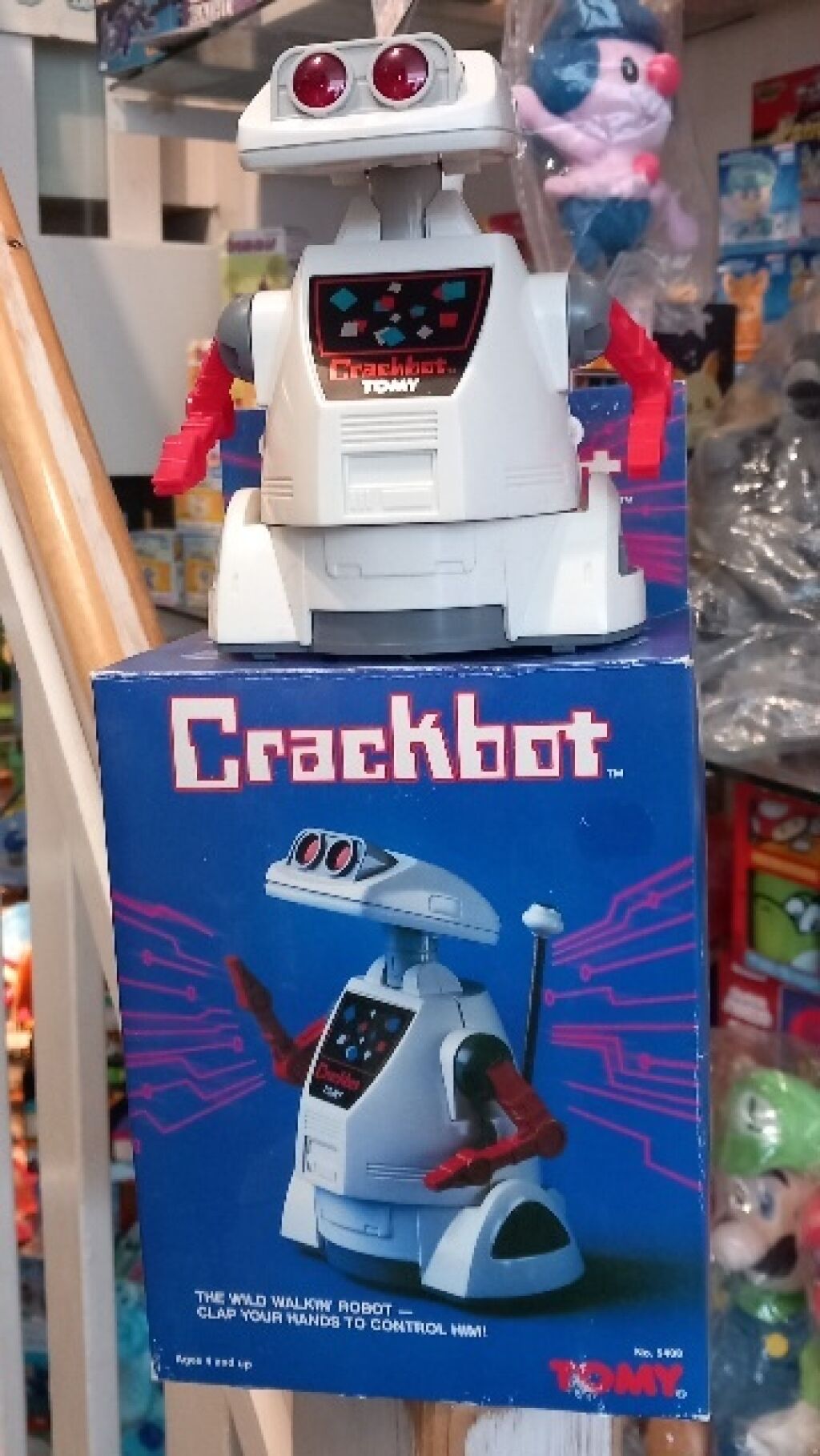 Vintage Robot Crackbot. Gemaakt door Tomy in 1985. Met de originele verpakking en in werkende staat. Verzendmethode binnen Nederland is pakketpost.